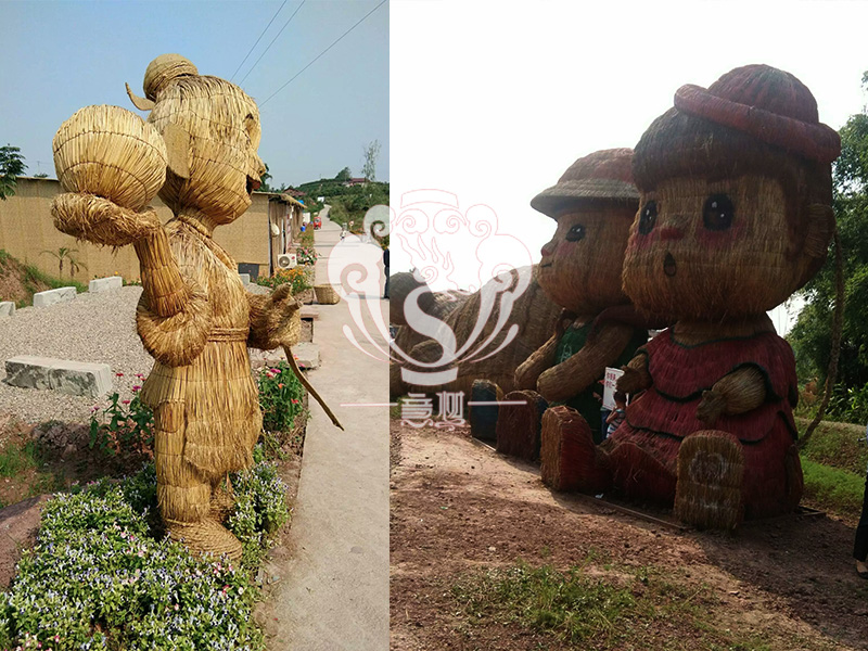 現在的精致稻草人藝術通常是由專業美術老師的造型放樣,然后由焊工師傅焊接出立體造型造型,然后以稻草或者稻草繩為材料編捆制作而成。